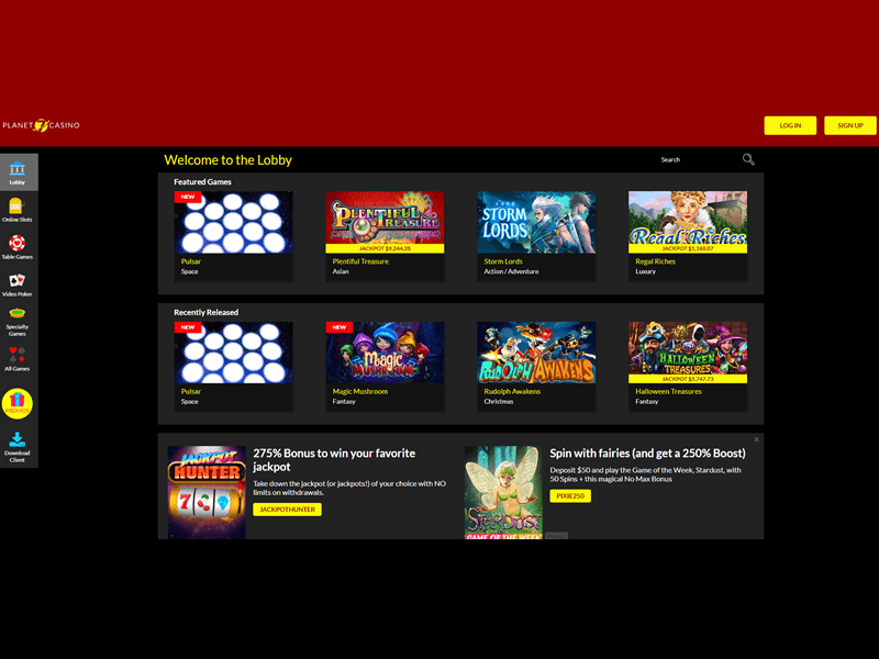 Regulars at Planet 7 Casino get occasional no deposit, free spins, reload, cashback bonuses, and more. The size of the bonuses and promos will vary depending on the status of the player within the VIP program.
